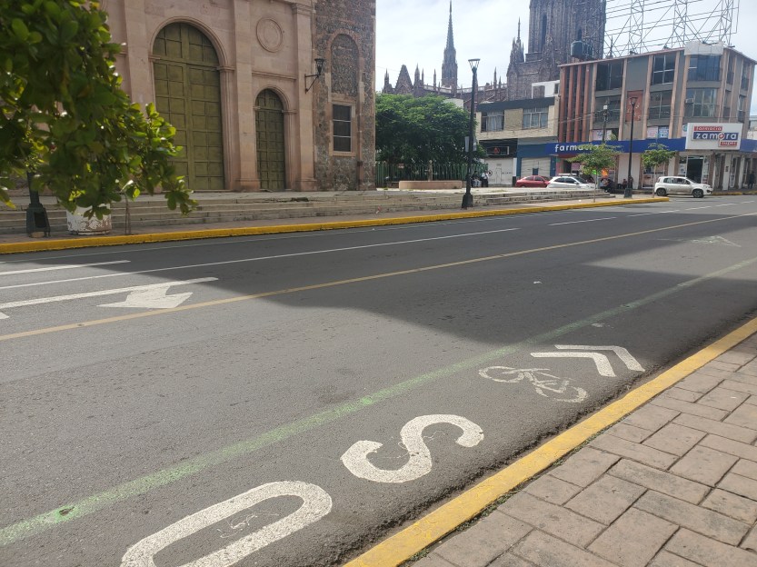 Between Jacona and Zamora, there is a beautiful pedestrian way that makes it easy for pedestrians and cyclists to commute between the two cities. Rarely is there a time when someone is not on that walkway. There are buses, but based on the small size of both cities, it makes more sense to walk or cycle wherever one is going. Coming into the city, there are no sidewalks for at least 3 kilometers, and the highway entrance is at the top of the hill–and yes, people were walking on the side of the highway. Also, one actually has to make it into the town before any street lights or ancillary businesses are visible.